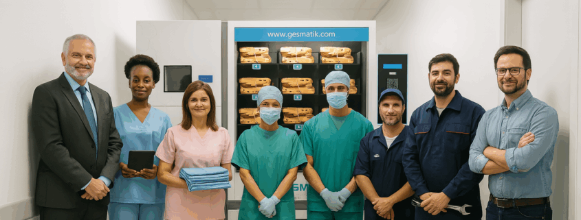 Inicialmente concebida como solución de vending industrial, GESMATIK se está extendiendo con rapidez en el sector sanitario: máquinas de pijamas quirúrgicos, expendedoras de zuecos, dispensadoras de mascarillas y todo tipo de suministros y ropa de hospital.