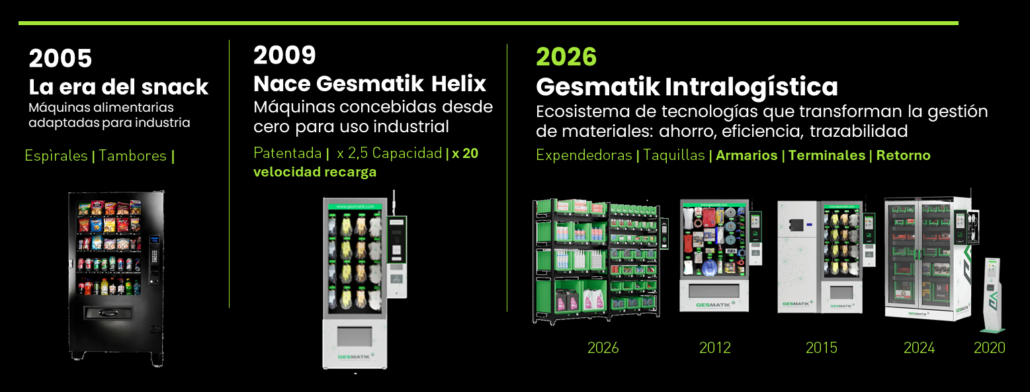 Gesmatik es una empresa española especializada en soluciones de intralogística industrial desde 2009. Sus productos incluyen la máquina expendedora HELIX con tecnología de extracción patentada, el software de gestión SIGNED, y las soluciones SKALEX para control de inventarios en tiempo real. Presente en México, Italia, Francia, Portugal, Costa Rica, Islandia y con expansión activa en Europa y Latinoamérica.